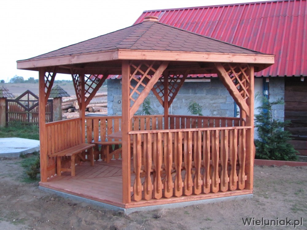 Altany ogrodowe wykonywane są z drewna sosnowego. Każda altana drewniana jest ustawiana na odpowiednio rozmieszczonych i wypoziomowanych podkładach betonowych, które zabezpieczają przed gromadzeniem się wody pod podłogą altany i zapewniają cyrkulację powietrza pod podłogą. Stosujemy również agrowłókninę, której zadaniem jest zapobieganie przerastaniu roślinności między deskami podłogowymi. Słupy altany mają wysokość 200 cm, natomiast całkowita wysokość altany wynosi 270 cm. Dachy altan wykonane są z desek boazeryjnych oraz pokryte gontem bitumicznym co zapewnia długoletnią trwałość każdej altany oraz odpowiednie wrażenia estetyczne. Każda z altan wyposażona jest w zestaw mebli, na który składają się stół z sześciokątnym blatem oraz 5 ławek, zamocowanych do altany. Wszystkie elementy altany są odpowiednio strugane oraz dwukrotnie impregnowane. Na życzenie klienta możemy zamontować w altanie oświetlenie oraz dodatkowe kratownice. Wszystkie altany montujemy samodzielnie. Dostarczamy nasze produkty na terenie Polski oraz zagranicę. Koszty transportu uzgadniamy indywidualnie z każdym klientem.