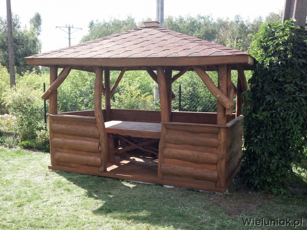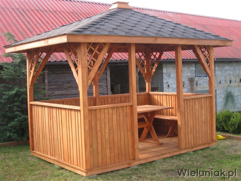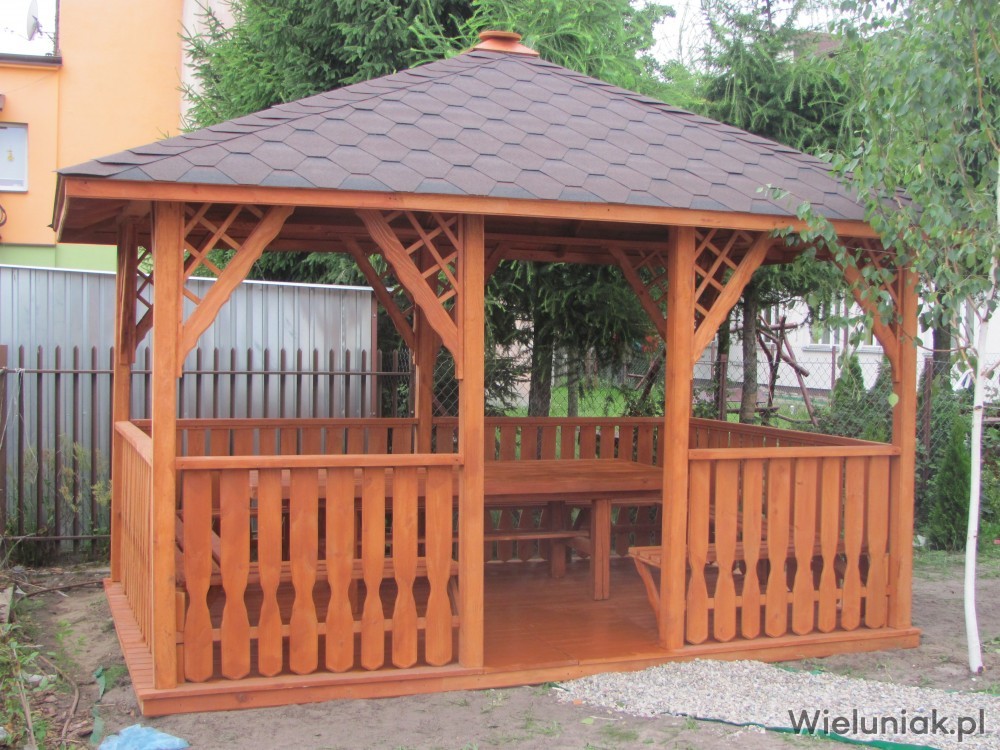 Altany ogrodowe wykonywane są z drewna sosnowego. Każda altana drewniana jest ustawiana na odpowiednio rozmieszczonych i wypoziomowanych podkładach betonowych, które zabezpieczają przed gromadzeniem się wody pod podłogą altany i zapewniają cyrkulację powietrza pod podłogą. Stosujemy również agrowłókninę, której zadaniem jest zapobieganie przerastaniu roślinności między deskami podłogowymi. Słupy altany mają wysokość 200 cm, natomiast całkowita wysokość altany wynosi 270 cm. Dachy altan wykonane są z desek boazeryjnych oraz pokryte gontem bitumicznym co zapewnia długoletnią trwałość każdej altany oraz odpowiednie wrażenia estetyczne. Każda z altan wyposażona jest w zestaw mebli, na który składają się stół prostokątny oraz 5 ławek, zamocowanych do altany. Wszystkie elementy altany są odpowiednio strugane oraz dwukrotnie impregnowane. Na życzenie klienta możemy zamontować w altanie oświetlenie oraz dodatkowe kratownice. Wszystkie altany montujemy samodzielnie. Dostarczamy nasze produkty na terenie Polski oraz zagranicę. Koszty transportu uzgadniamy indywidualnie z każdym klientem.