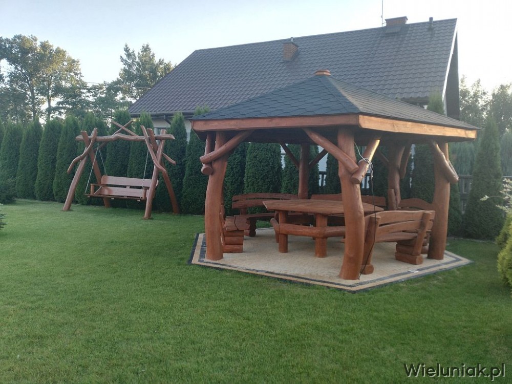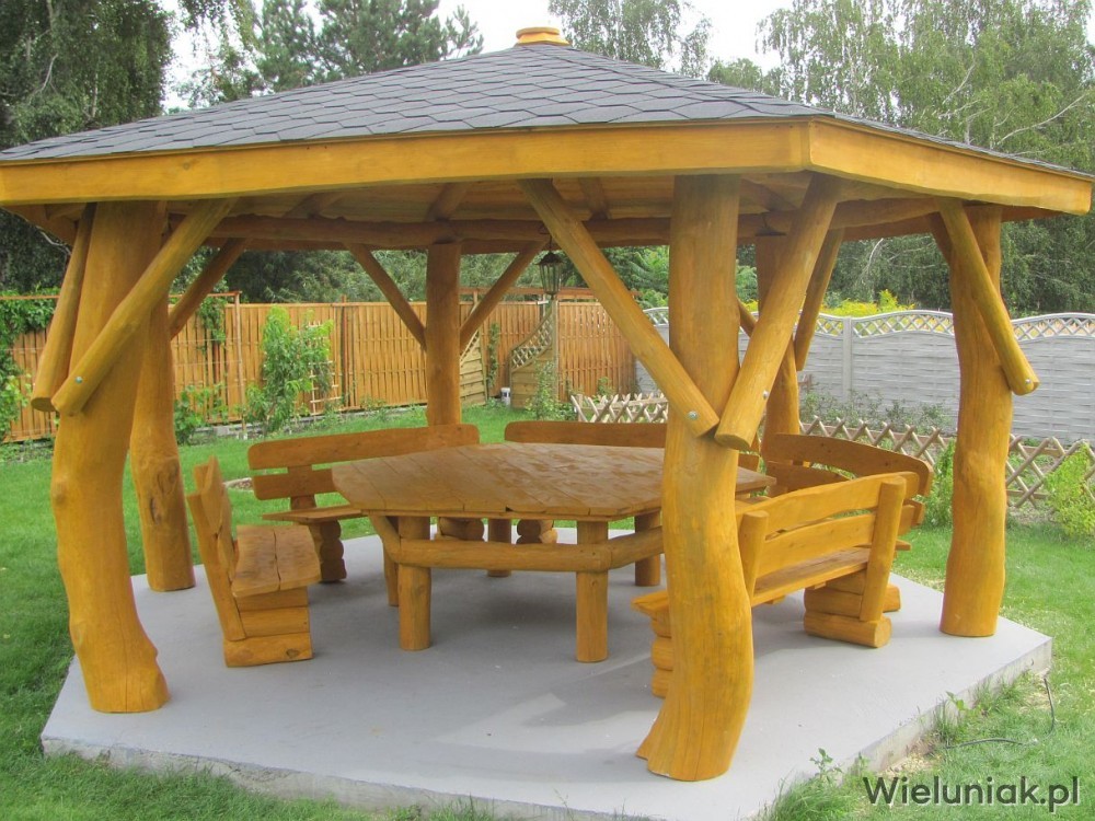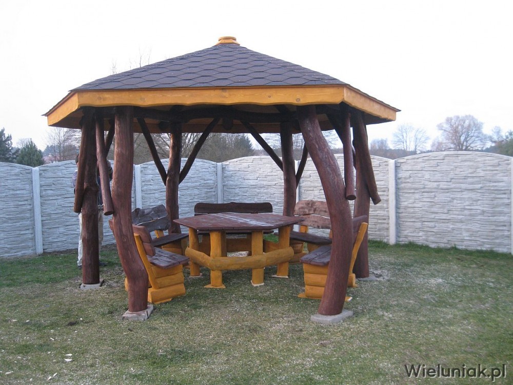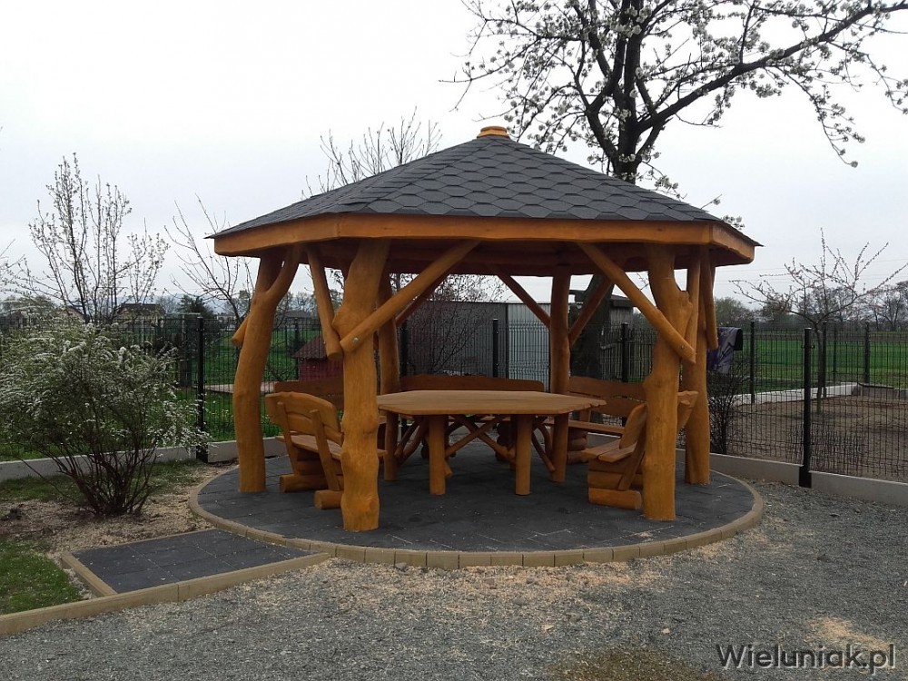 - stół sześciokątny (blat z bala drewna liściastego o gr. 4cm) przystosowany do rozmiaru altany oraz