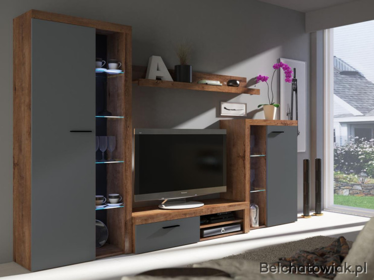 Meblościanka posiada otwarte szklane półki, które można podświetlić oświetleniem LED co jeszcze bardziej podkreśli charakter mebla