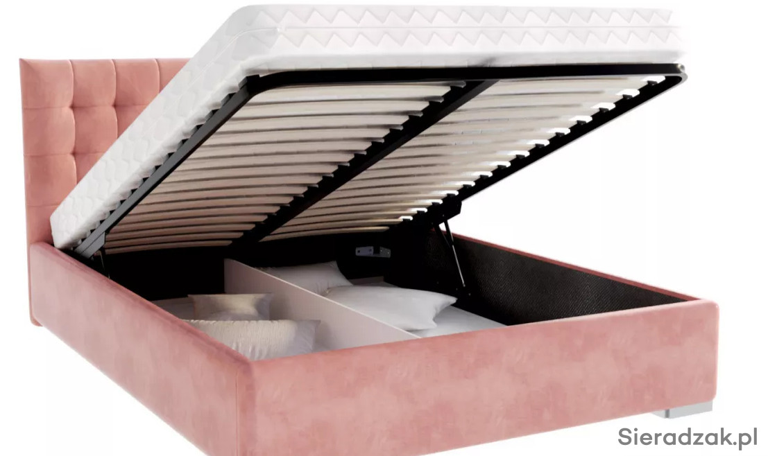 Aby zyskać na funkcjonalności łóżka, dodaliśmy do niego podnoszony stelaż. Dwa siłowniki gazowe ułatwiają jego podnoszenie, nie trzeba użyć dużo siły, aby go unieść. Rozstaw listew w stelażu jest odpowiedni, aby materac na nim leżący miał zapewnioną właściwą wentylację, a przy okazji nie uległ odkształceniu. Dzięki temu nie osadza się w nim ani wilgoć czy roztocza i możemy cieszyć się higienicznymi warunkami snu podczas każdej nocy. Sprężynujące listwy umieszczone w specjalnych uchwytach pracują wraz z materacem, co dodatkowo korzystnie wpływa na wygodę. Wykonano je w taki sposób, aby nie rozwarstwiały się i nie niszczyły oraz służyły przez wiele lat.