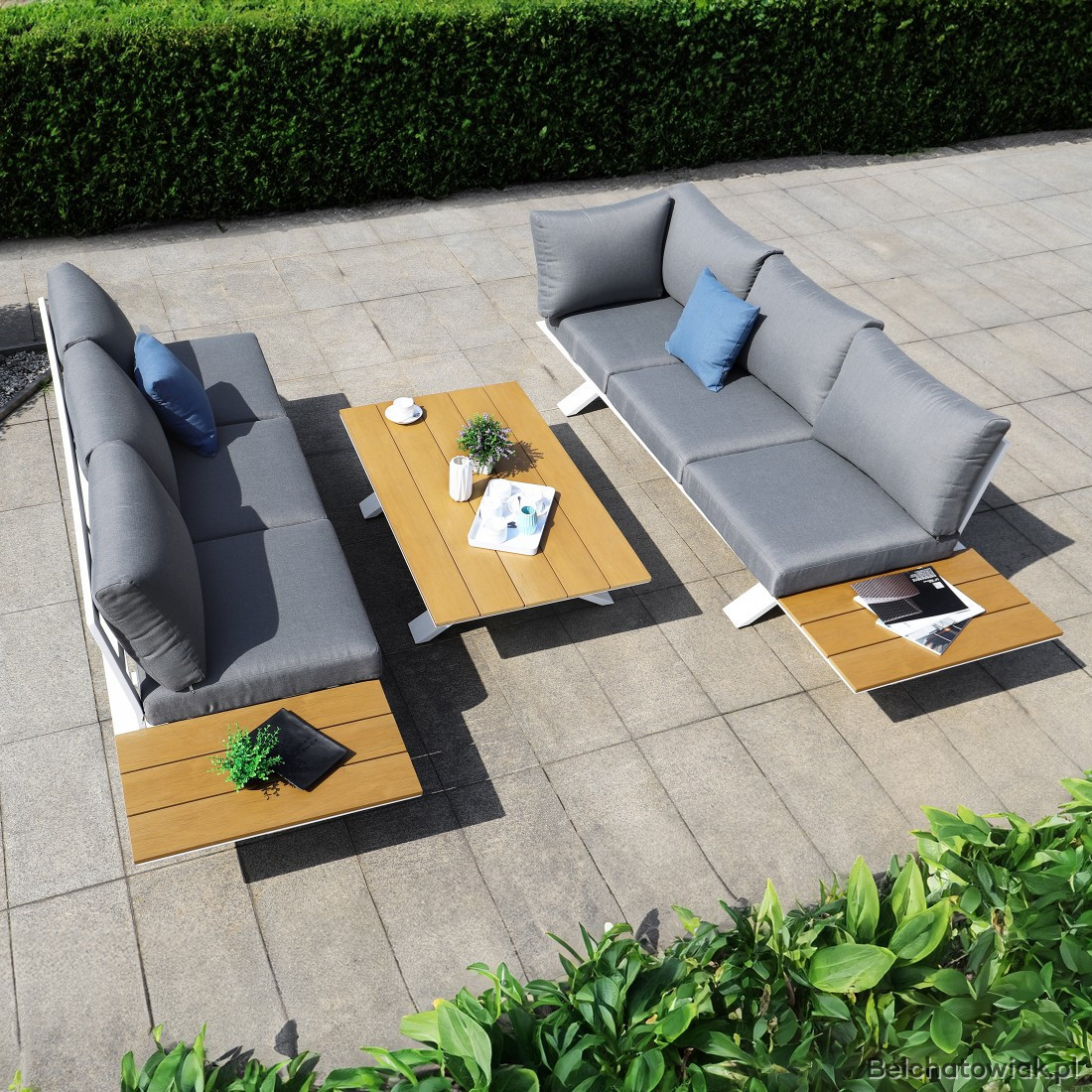 Meble wykonane są z trwałych materiałów odpornych na warunki atmosferyczne. Poszewki na poduszki można ściągać i prać, co ułatwia ich pielęgnację. Zestaw jest łatwy w czyszczeniu i stabilny, gwarantując komfort podczas siedzenia i leżenia.