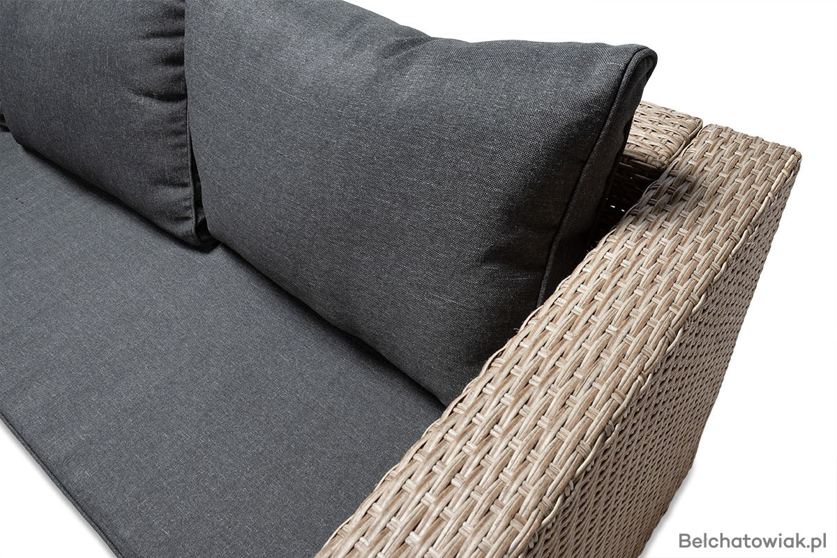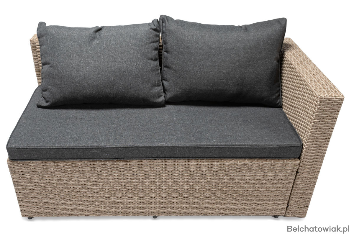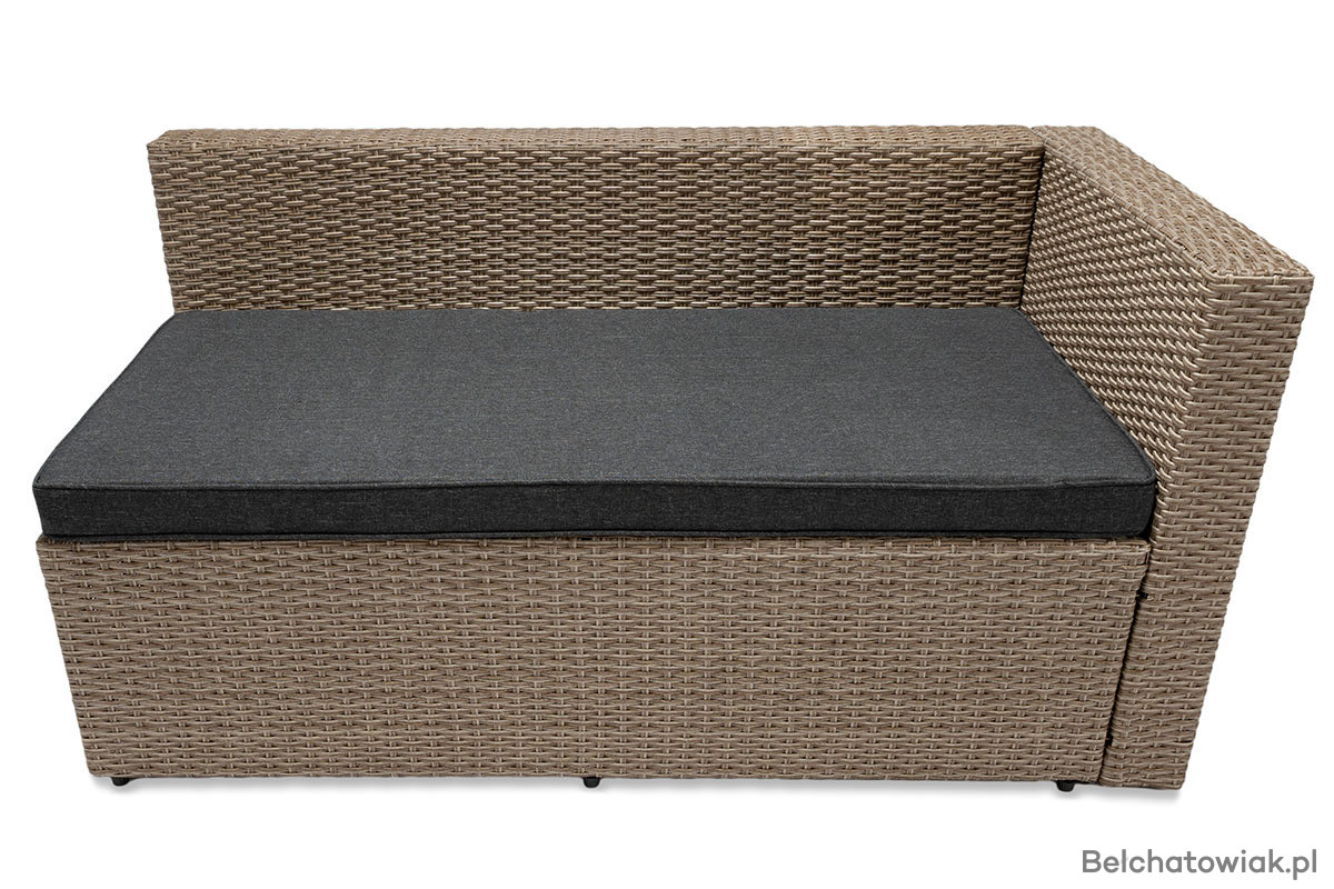 Lewostronny układ narożnika oznacza, że dłuższy bok znajduje się po lewej stronie (patrząc na mebel z przodu). To ważne przy planowaniu przestrzeni – ten model doskonale sprawdzi się w miejscach, gdzie klasyczny narożnik prawostronny się nie zmieści lub nie pasuje do układu ogrodu czy tarasu.
