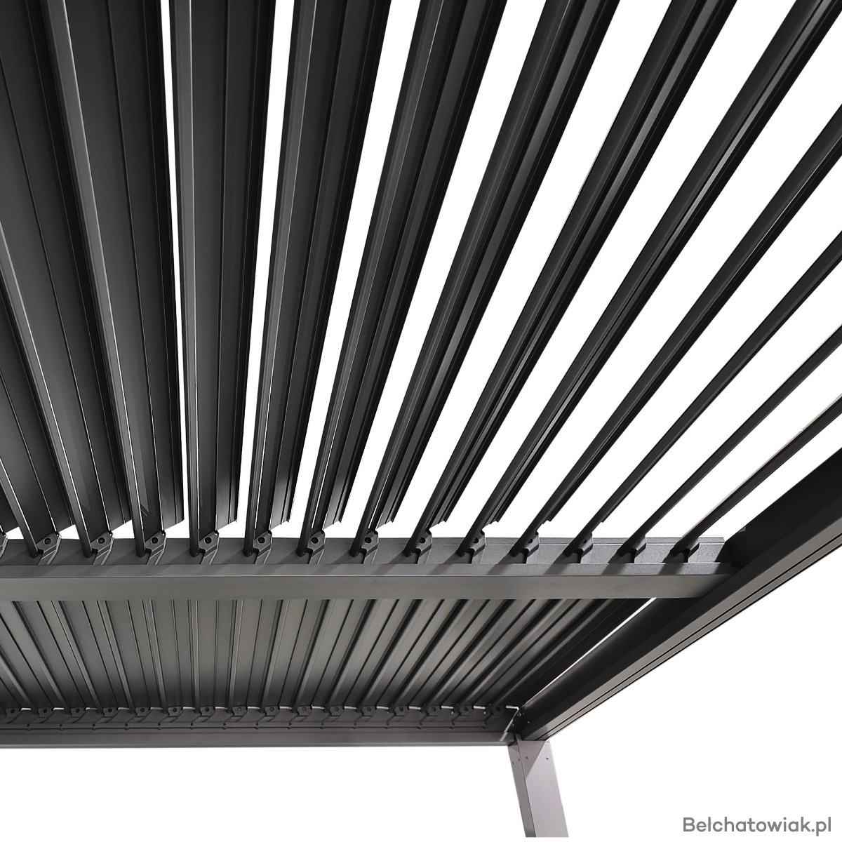 Największym atutem tej pergoli jest nowoczesny system dachu lamelowego – pozwala on na precyzyjne ustawienie kąta nachylenia, co umożliwia: