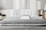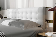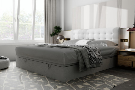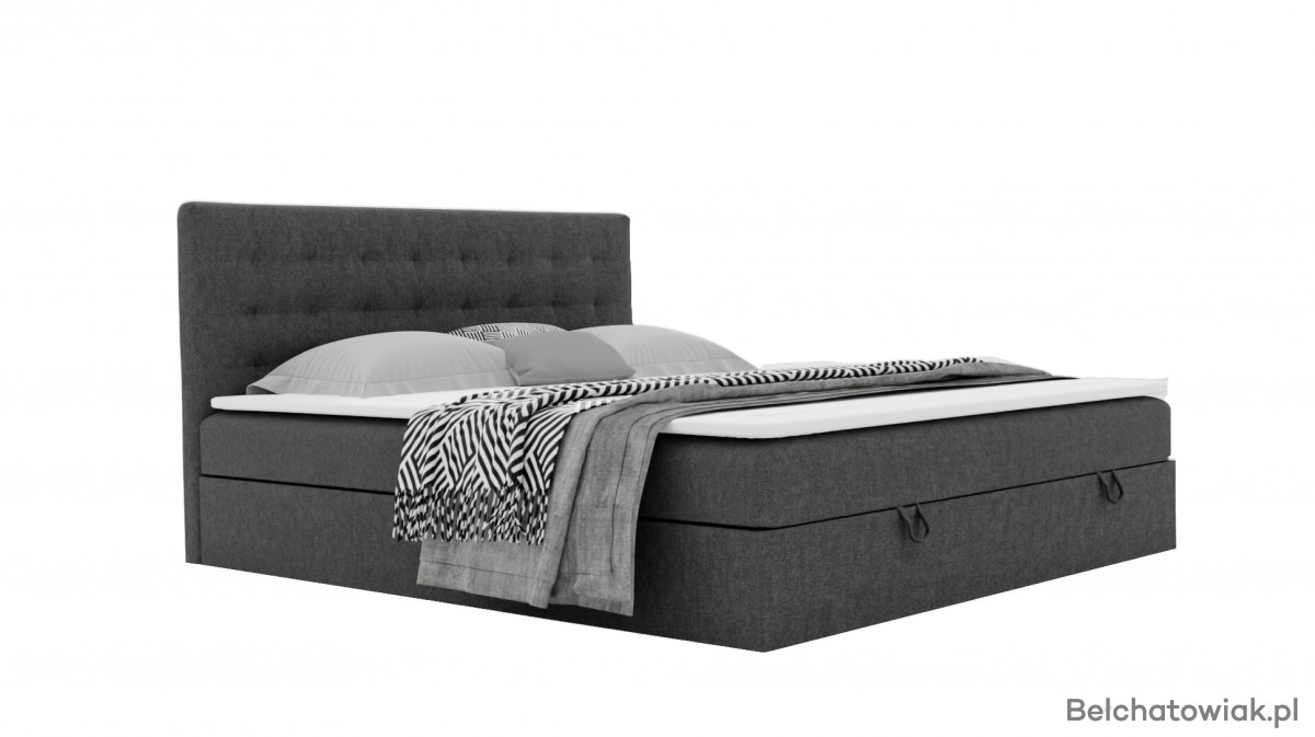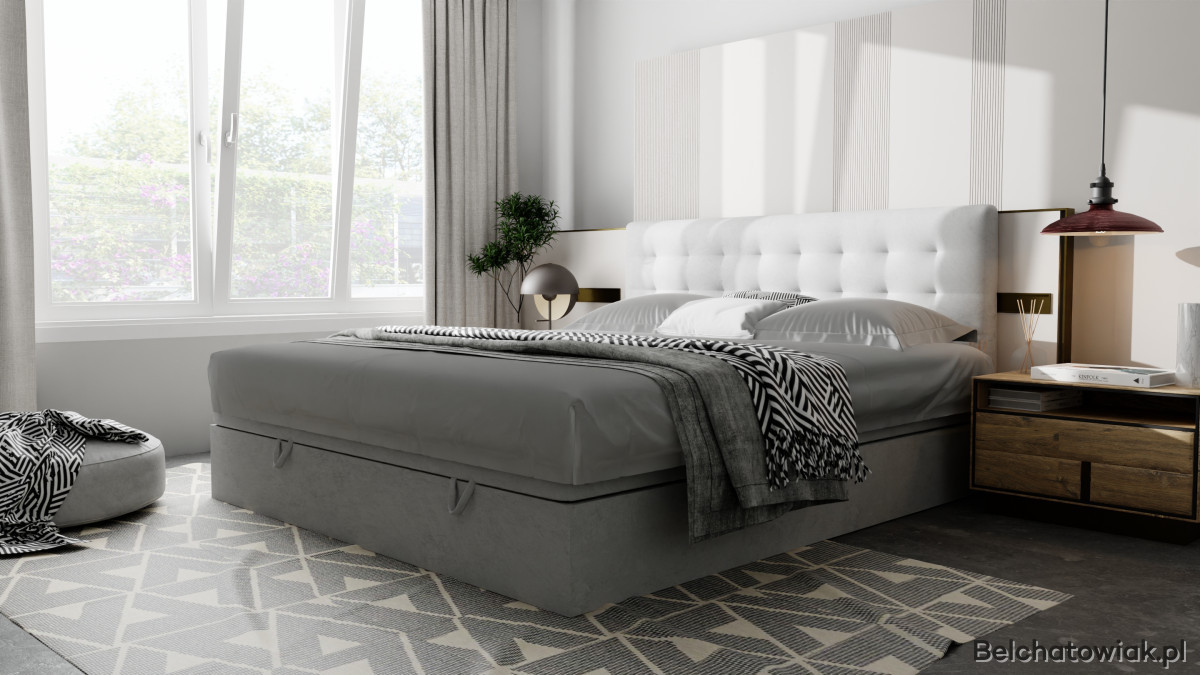 Dolna część łóżka skrywa pojemnik na pościel, idealny do przechowywania dodatkowych koców, poduszek i pościeli. Łatwy dostęp i wygodne otwieranie pojemnika ułatwiają utrzymanie porządku w sypialni.