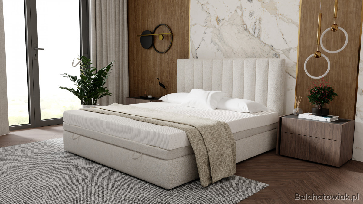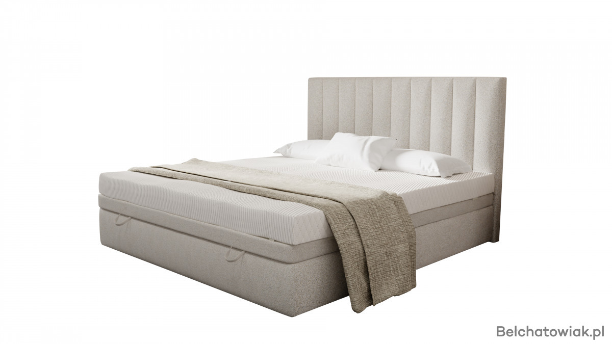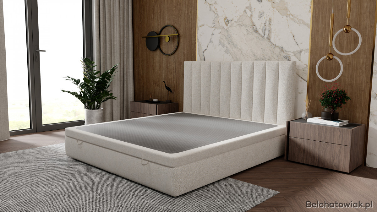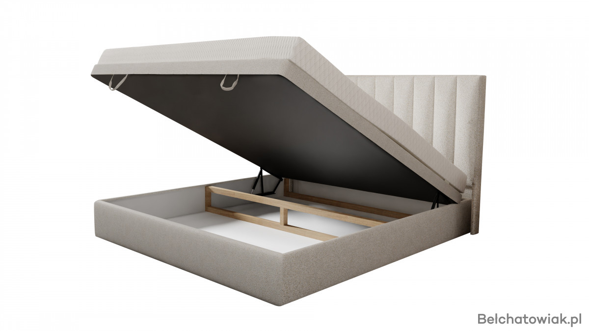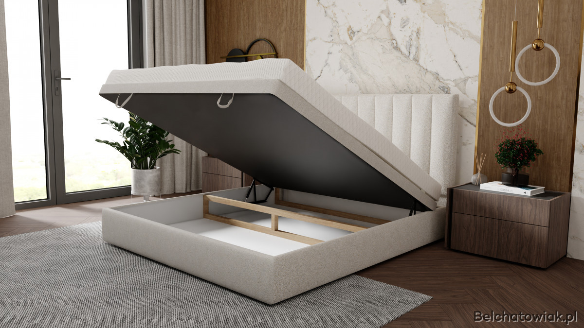 Łóżko tapicerowane z pojemnikiem na pościel – otwierane od przodu, zapewnia łatwy dostęp i porządek w sypialni